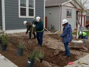 Volunteers plant a treePace connected with Eric Wells, Pikes Peak Habitat director of construction services, when she requested a letter of support from potential partners for a Landscape Transformation for Future Construction grant. And the collaboration was born.